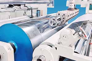 主機上料系統采用真空上料機(每個擠出機配一個) 螺桿直徑:Φ75MM 螺桿長徑比:37:1 螺桿材質:38CrMoALA氮化處理 螺桿最高轉速:105轉/分 最大擠出量:150X2公斤/小時 料筒加熱采用鑄鋁加熱圈、固態繼電器控制加熱。 料筒加熱總功率:32X2KW 模頭采用內置不銹鋼加熱管,固態繼電器控制加熱 模頭長度:900MM 出膜有效長度:800mm 出膜厚度:0.012-0.05mm 模頭加熱總功率:18X2KW 覆膜克重:電腦控制-設定克重自動調整 主電機:西門子交流電機 電機功率:22X2KW 換網方式:長效過濾網 環保排煙:風機帶排煙口 |
